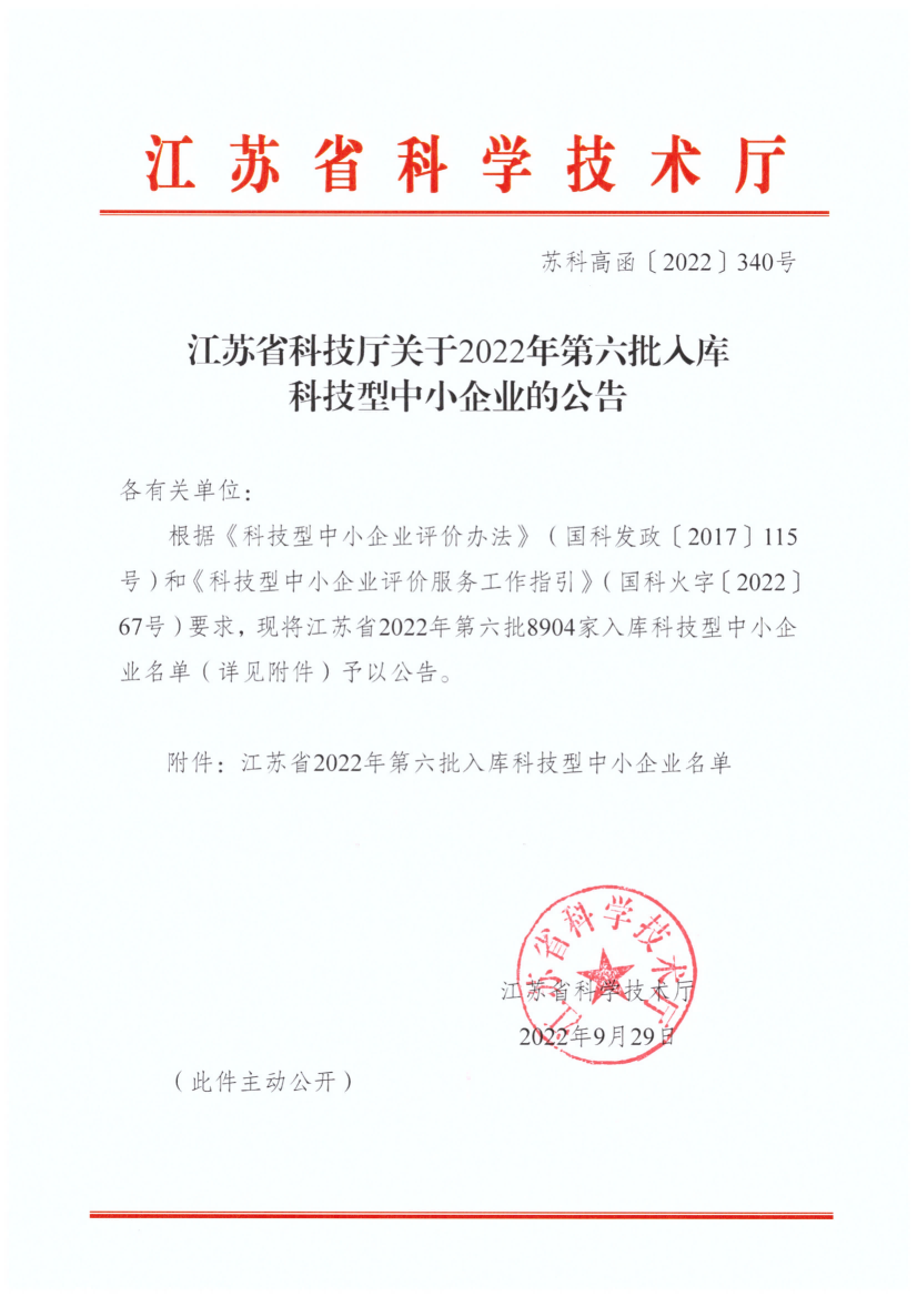經(jīng)鎮(zhèn)江市科技局、江蘇省科學技術(shù)廳兩級行政主管部門審核,我司于2022年9月29日被江蘇省科學技術(shù)廳正式授予“科技型中小企業(yè)”稱號。